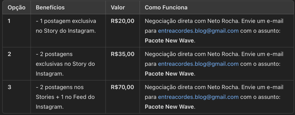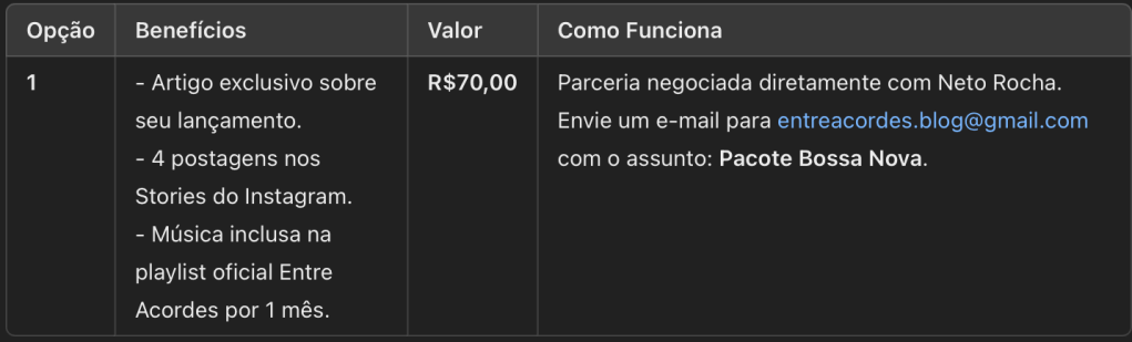 Se você é artista ou empresa e gostaria de divulgar seu trabalho conosco, confira as opções de pacotes abaixo. Para propostas personalizadas, entre em contato pelo e-mail: entreacordes.blog@gmail.com com o assunto: “Proposta de Parceria”.